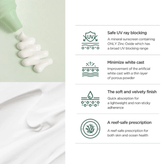 حاوی عصاره سنتلا آسیاتیکا، درخت چای، آرتمیسیا کاپیلاریس و هوتوینیا کورداتا جهت تسکین پوست های آسیب دیده منعکس کننده انواع اشعات UVA و UVB و