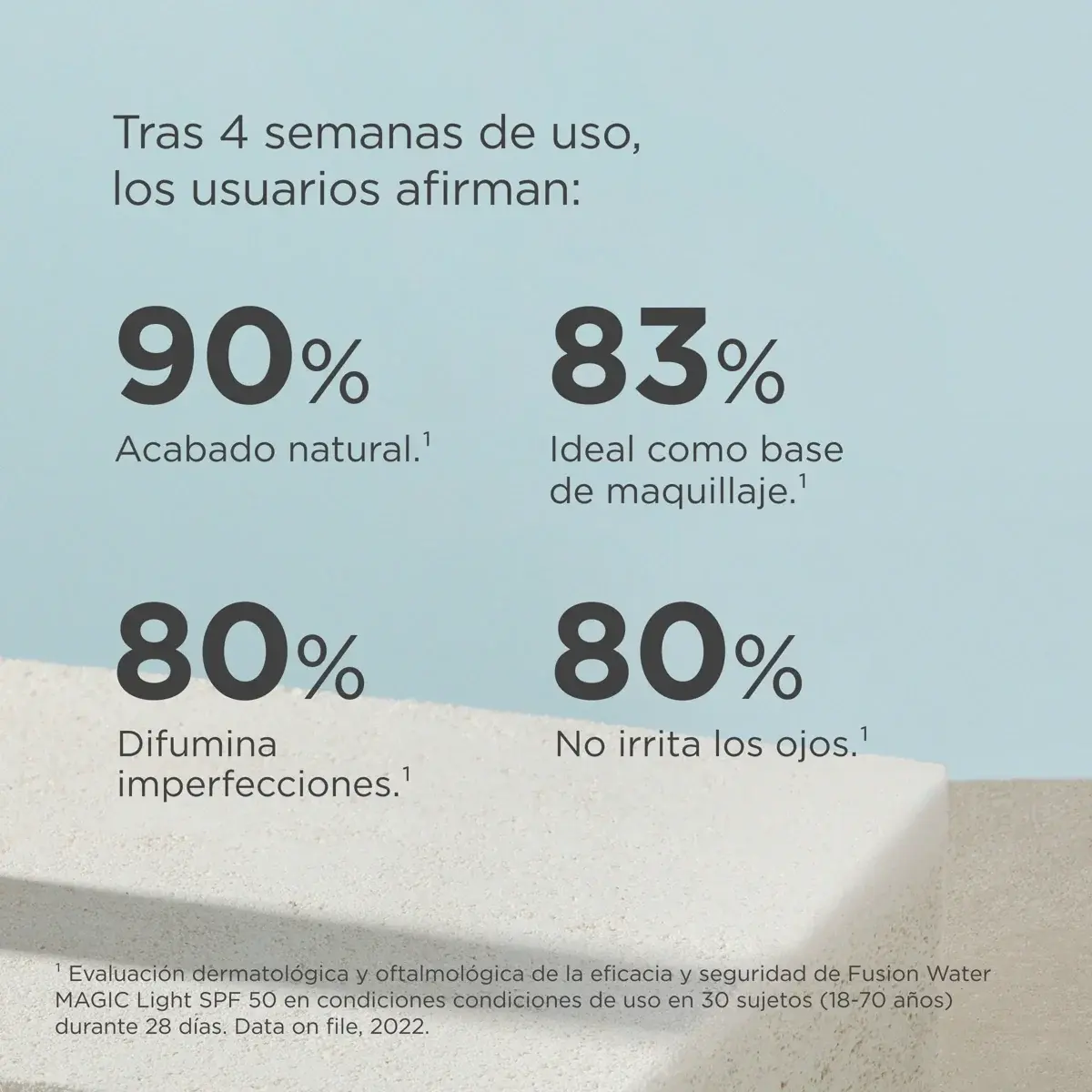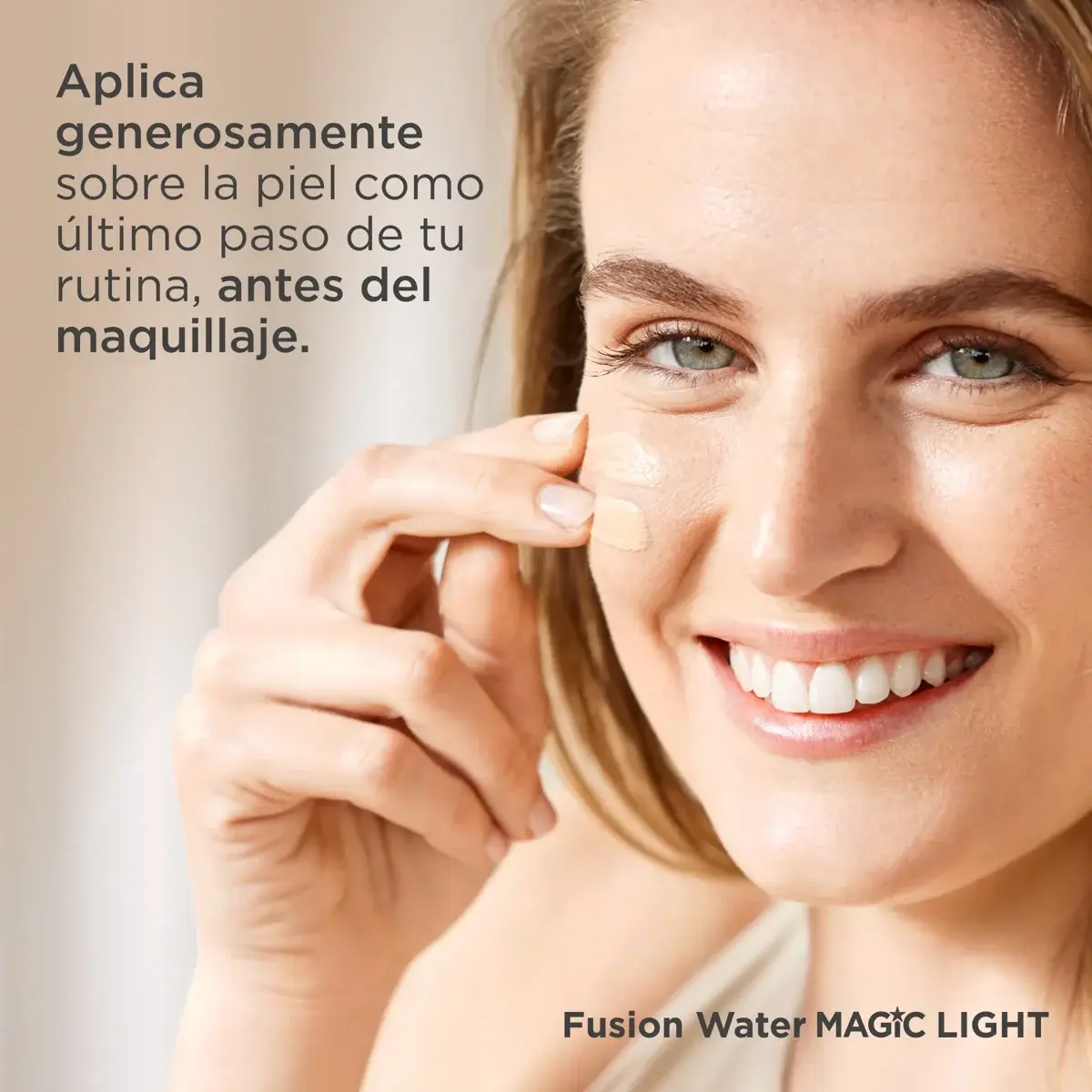 ضد آفتاب ایزدین مدل فیوژن واتر مجیک رنگ لایت Fusion Water Magic حجم 50 میل بی رنگ است و یک انتی اکسیدان قوی برای پوست است که با اس پی اف 50 از پوست در برابر اشعه های UVA UVB محاقظت کرده. این ضدآفتاب، حاوی اسید هیالورونیک بوده و پوست را هیدراته و مرطوب خواهد کرد. علاوه بر این، در برابر آب و تعریق مقاوم بوده و برای انجام فعالیت های روزانه و ورزش در فضای باز مناسب است. این محصول، بافتی غیرکومدوژنیک داشته و باعث مسدود شدن منافذ نمی شود.