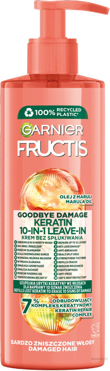کرم مو ۱۰کاره گارنیه نارنجی برای موهای بسیار آسیب دیده 400 میل یک محصول مراقبت از مو فرانسوی است که دارای خواصی همچون ترمیم موهای آسیب دیده و بهبود ساختار مو میباشد. این محصول حاوی روغن مارولا، عصاره روغن املا و کمپلکس کراتین 7% است که میتواند مو را تغذیه کرده و استحکام آن را افزایش دهد. در نتیجه از شکنندگی موی آسیب دیده جلوگیری کرده و مانع از ضعیفتر شدن آن میشود. روغن مارولا در این محصول قادر است رطوبت مورد نیاز مو را به آن بازگردانده و باعث شادابی و سلامت مو شود.