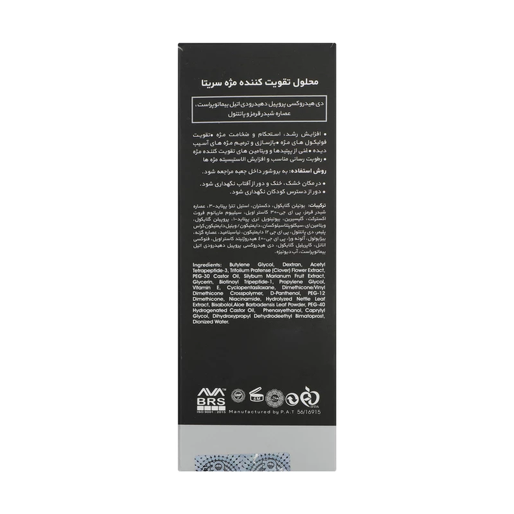 محلول تقویت کننده مژه سریتا، یکی از تخصصیترین محصولات موجود در بازار برای درمان ریزش مژه و افزایش طول، حجم و ضخامت آن ها است. یکی از ترکیبات به کار رفته در این محصول شبدر قرمز است که با داشتن خاصیت آنتی اکسیدانی باعث مهار رادیکالهای آزاد میشود. این محصول به واسطه داشتن ویتامینهای B3 و B5 علاوه بر افزایش انرژی رسانی به تارهای مژه باعث رطوبت رسانی به آن ها و جلوگیری از خشکی مژه میشود.